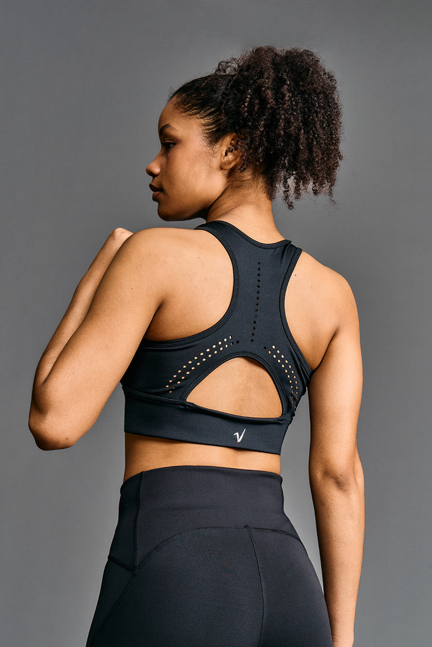 Este top deportivo de soporte medio es perfecto para entrenamientos de impacto moderado. Con un diseño de espalda deportiva y perforaciones láser estratégicas para una ventilación óptima, proporciona una sujeción cómoda y segura, ideal para actividades como el running, spinning o entrenamientos en el gimnasio. Confeccionado en un tejido técnico suave y elástico, este top se adapta perfectamente al cuerpo, ofreciendo soporte sin restringir el movimiento. Pezoneras desmontables.