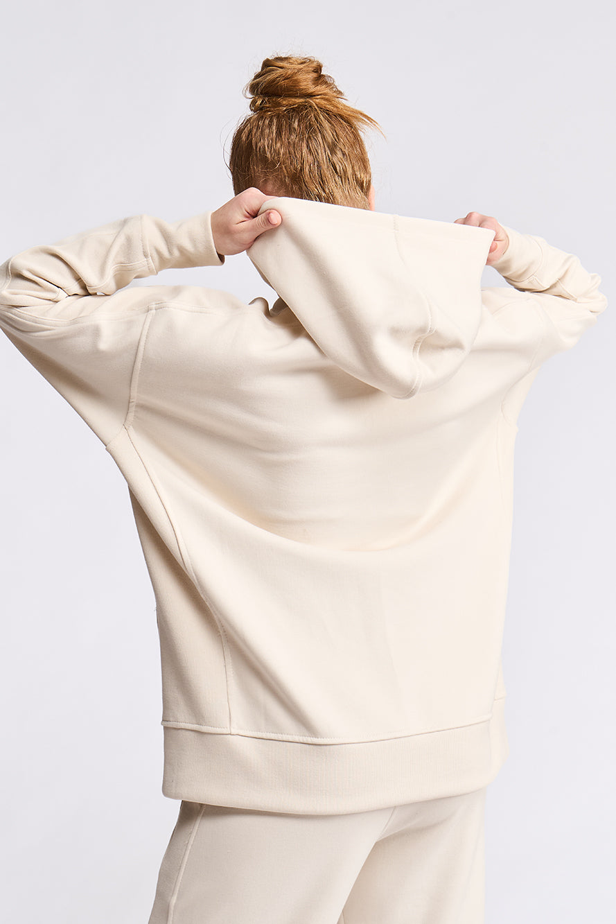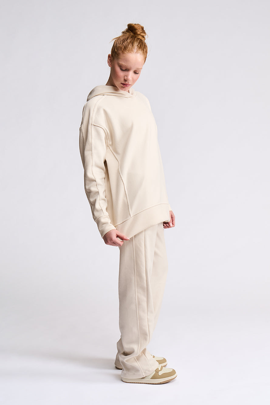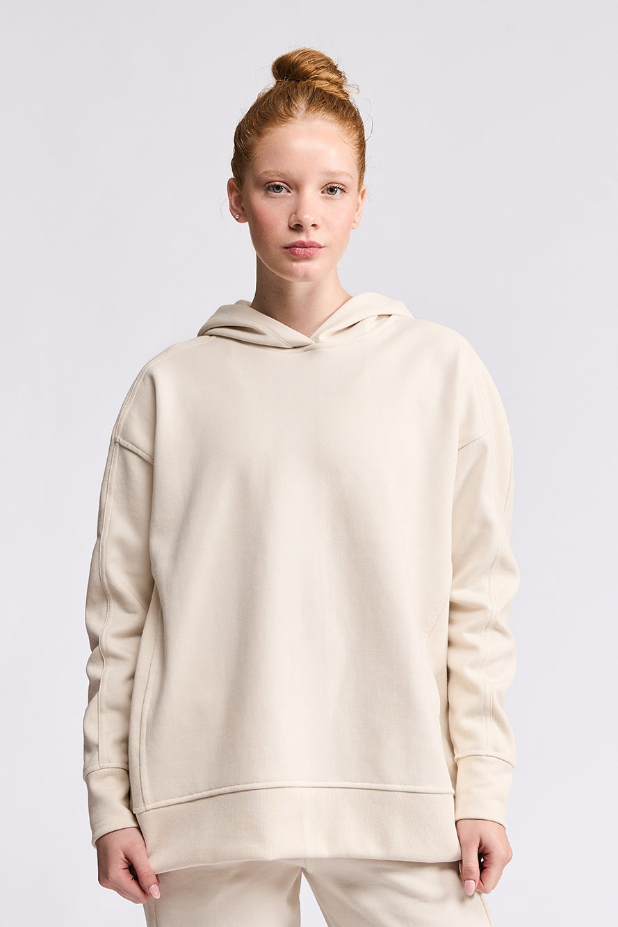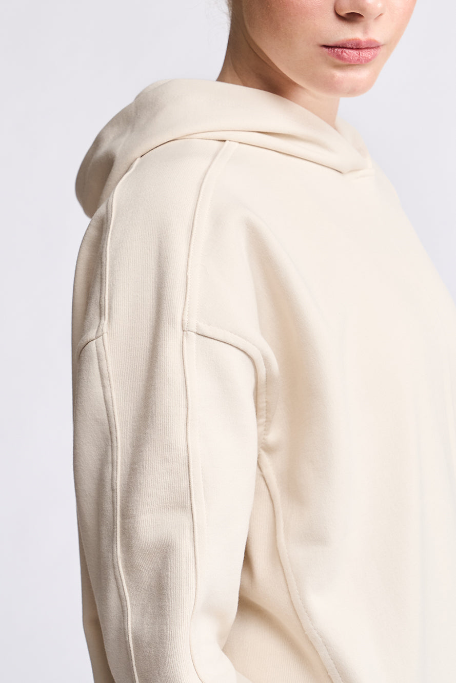 Comodidad, estructura y estilo se combinan en este buzo de intertrama, ideal para los días frescos. Confeccionado en tejido de algodón, ofrece una textura firme, suave y abrigada, manteniendo la forma con el uso. El diseño presenta una capucha amplia, mangas caídas y un calce holgado y relajado. Sus recortes laterales acanalados le aportan un detalle visual moderno que realza su silueta minimalista. Terminaciones en puños y cintura de rib ancho completan una prenda cómoda y versátil, perfecta para usar sola o en conjunto. Ideal para: uso diario, homewear o looks casuales con un toque sofisticado.